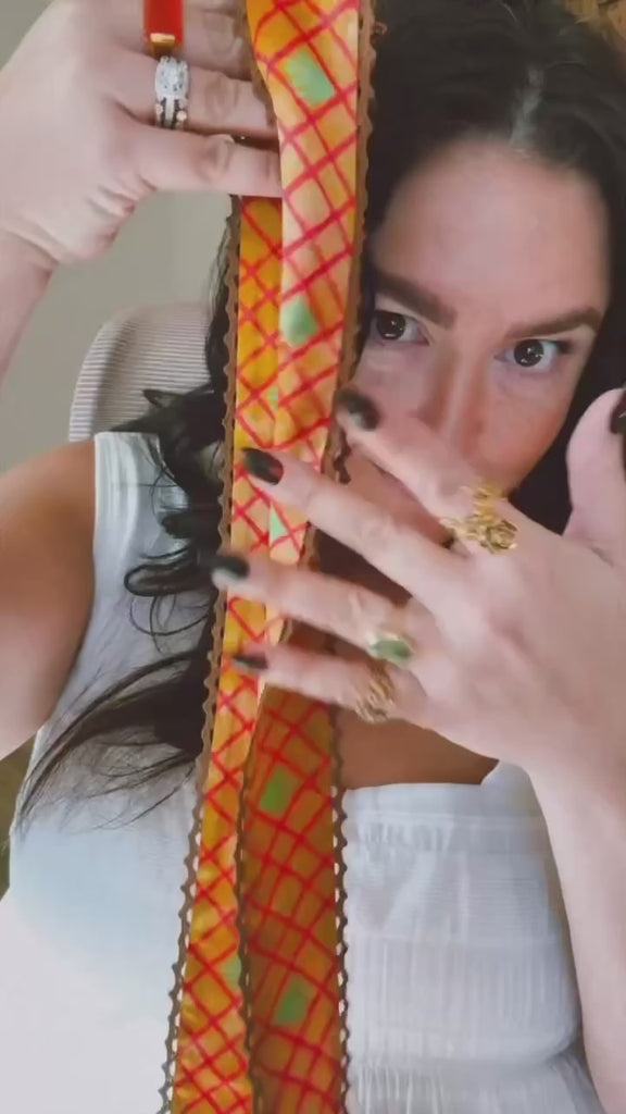Hand drawn art on a beautiful silk twilly with a crochet trimmed edge.